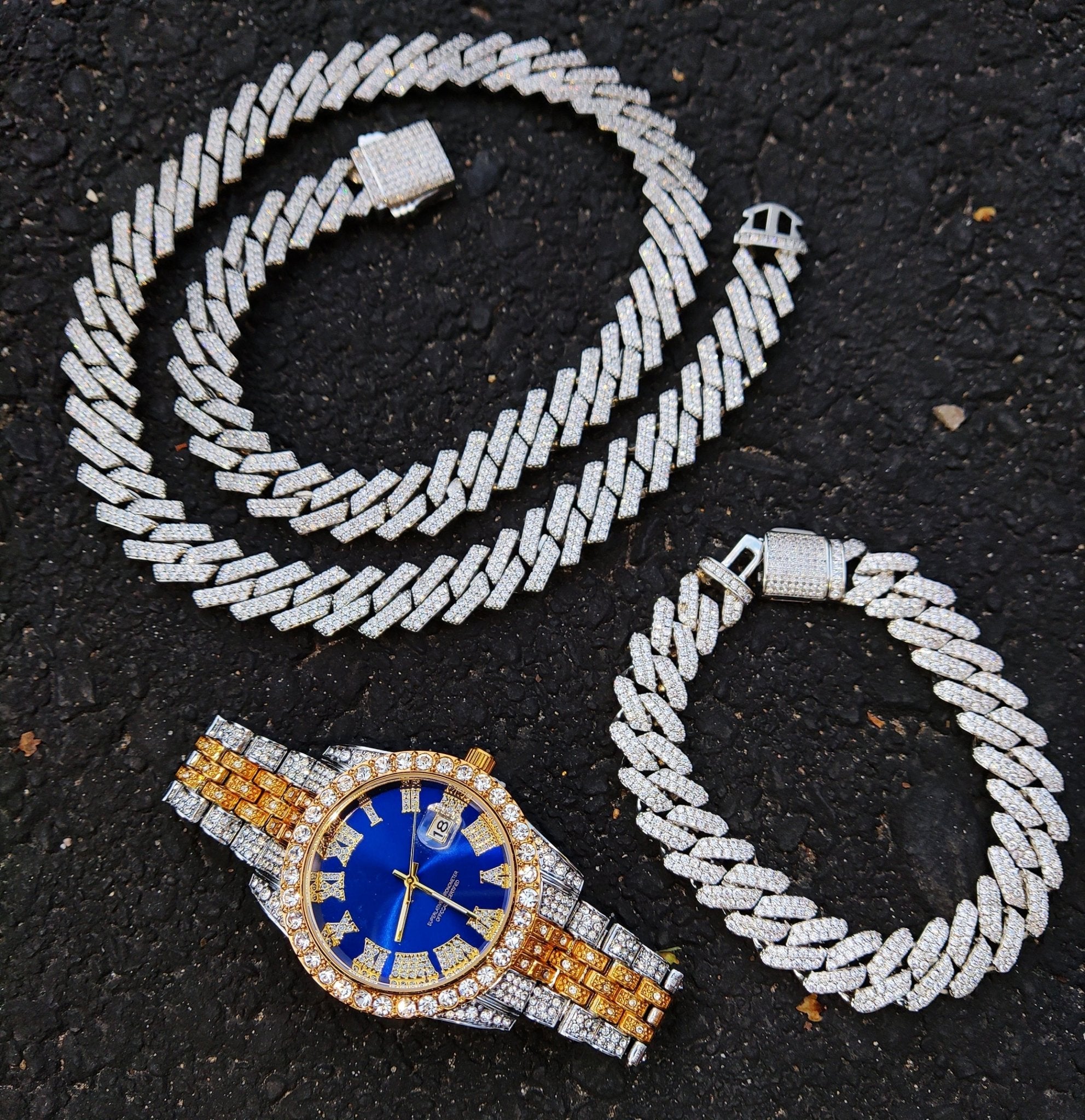 18k Gold Diamond Prong Cuban Link Watch Set (3 Pieces)